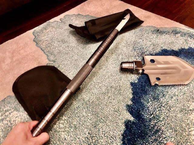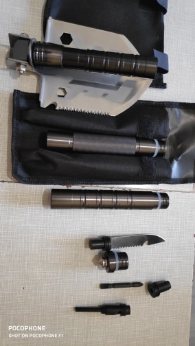 My trusty tri-fold shovel won't stay straight anymore, so I was in the market for a new shovel. I do a lot of dispersed camping and you know what that means! I dig a hole at least once a day. This shovel has been perfect so far - very sturdy and due to the rubber washers it stays solid when in use. I tried the farro rod (or flint and steel) and it makes a great spark. Overall, very decent product. Looks cool too.